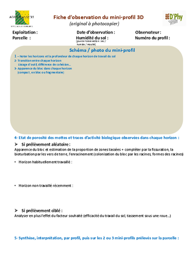 La méthode du mini-profil 3D consiste à prélever un bloc de sol avec les palettes d’un chargeur télescopique, ou d’un tracteur équipé d’un chargeur frontal, afin d’observer les horizons de travail du sol, la structure, l’enracinement, les traces d’activité biologique, et d’établir ainsi par observation un diagnostic de l’état structural du sol en un temps réduit.